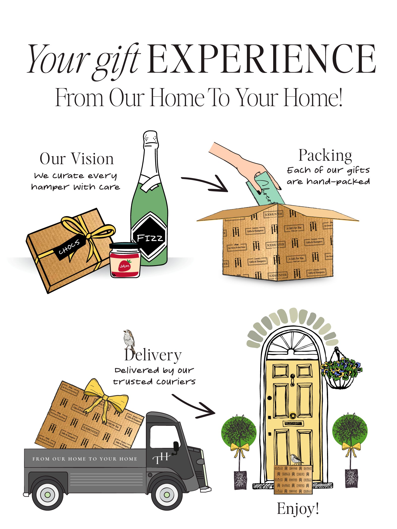 We are a quintessential British brand, creating high quality hampers filled with individually sourced artisan products and luxury goods. Based in Sussex, our design team work to create exceptional gifts that combine traditional craftsmanship, contemporary innovation and classic style. Whether you want to enjoy a countryside picnic, pamper a loved one, or host a glamorous party, there’s a Todhunter gift for every occasion.