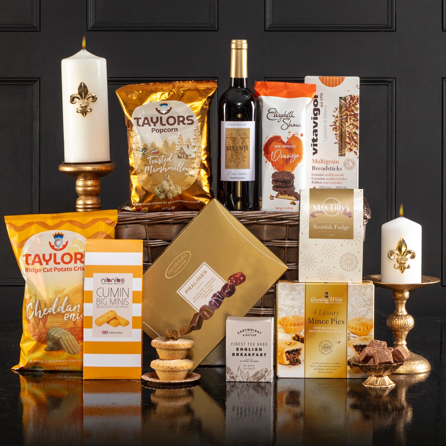 Introducing the Snowdrift Christmas Hamper. Step into a Winter Wonderland of scrumptious delights, carefully curated with both sweet and savoury lovers in mind. Indulge in a bottle of velvety red wine from Volunté, perfectly paired with cumin biscuits from Nibnibs and mature cheddar crisps from Taylors. When it’s time for something sweet, you'll be spoiled for choice with pralines from Excelcium, traditional Scottish fudge from Mrs Tilly’s, and Christmas classics like delicious mince pies from Grandma Wilds. Packed to please, the recipient will find all these goodies in a charming wicker and wood weave rectangular basket, each basket is woven by hand.