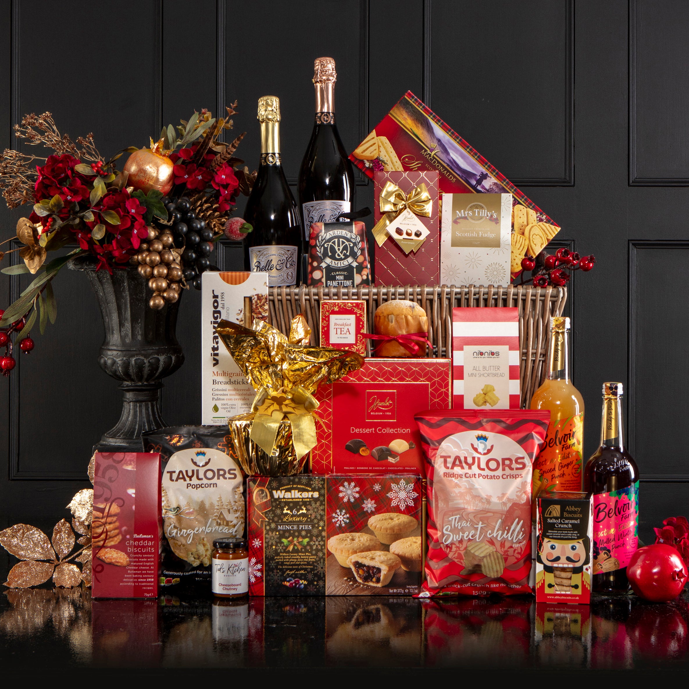 Introducing the Royal Christmas Hamper, a collection of luxury Christmas classics fit for royalty. At the heart of this Hamper are not one, but two bottles of Belle & Co alcohol-free fizz. This sparkling beverage offers the celebratory fizz of traditional champagne without the alcohol, making it a perfect addition for those who prefer non-alcoholic options. The crisp and refreshing taste, elegant packaging, and sophisticated flavour profile add a touch of class to any occasion, ensuring everyone can join in the merriment without compromise. To accompany this, we've included two bottles of Belvoir Seasonal Flavoured Presses’. Each is made with all-natural ingredients and bursting with flavour, making them a delightful alternative for seasonal celebrations. No Christmas Hamper would be complete without traditional Christmas classics. Indulge in Walker's classic mince pies, a traditional Christmas pudding from Chapel Bakery, and an Arden's panettone, just some of the delightful dessert offerings. The Royal Christmas Hamper is more than a gift - it's a whole experience, a celebration of seasonal flavours and family favourites. Start a tradition and send a Todhunter Hamper to show your appreciation and share the joy with the special people in your life. Packed to please, the recipient will find all these goodies in a charming wicker and wood weave rectangular basket, each basket is woven by hand.