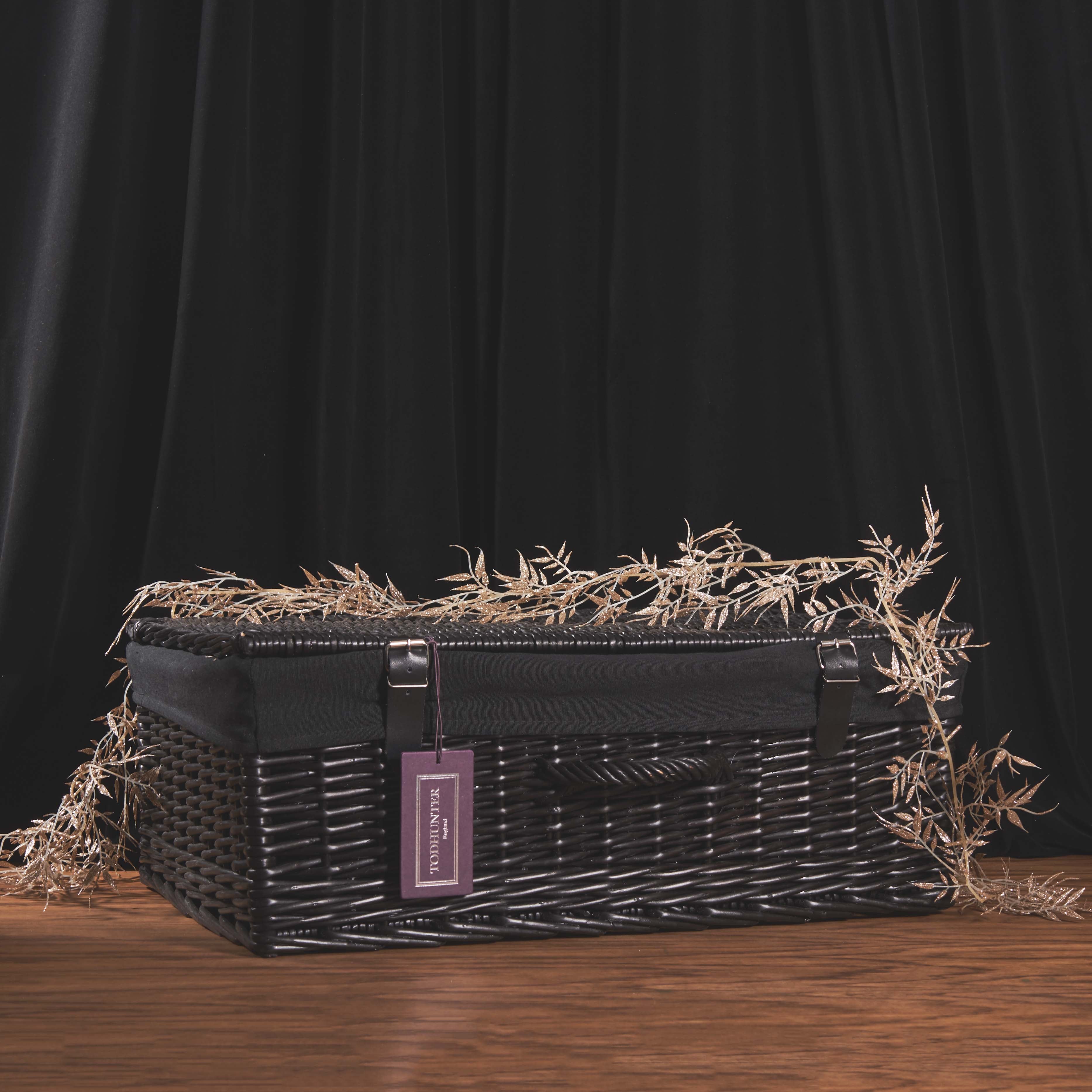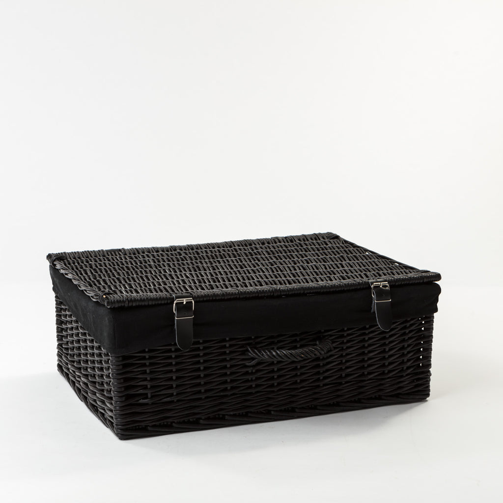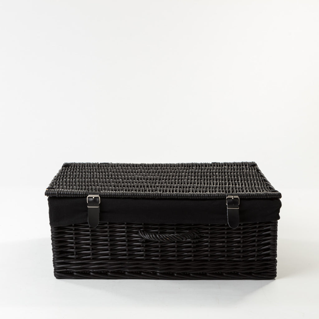 The Oxford Black 4 Person Unfitted Hamper with Liner from Todhunter. The black finish on this wicker hamper will create a very sophisticated and stylish picnic experience, or will fit perfectly in to any contemporary interior. Perfect for elegant gifting.